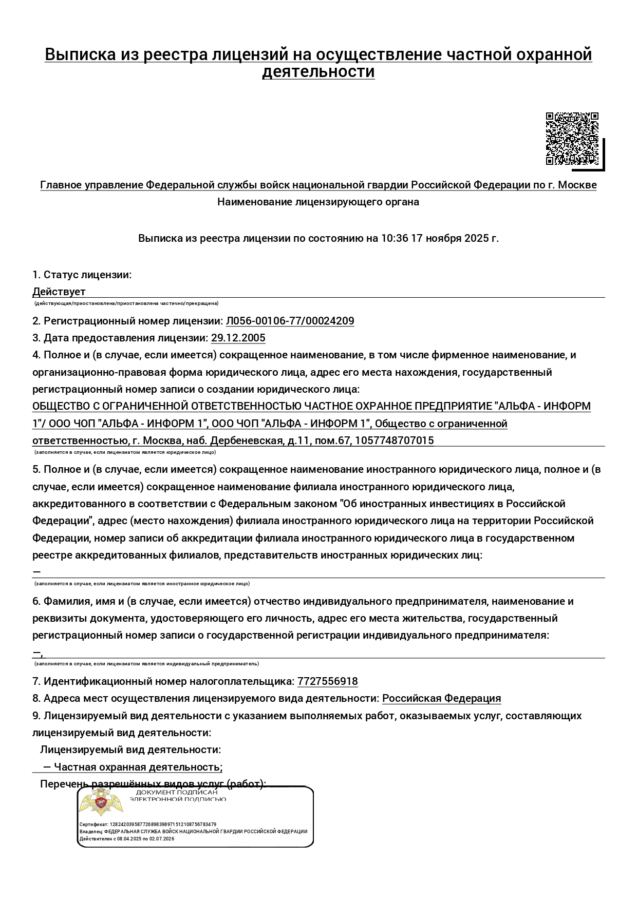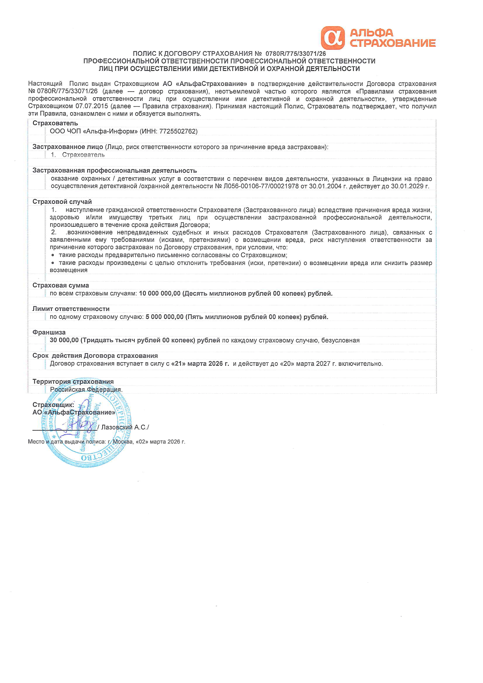 Страховой полис ООО ЧОП "Альфа-Информ"